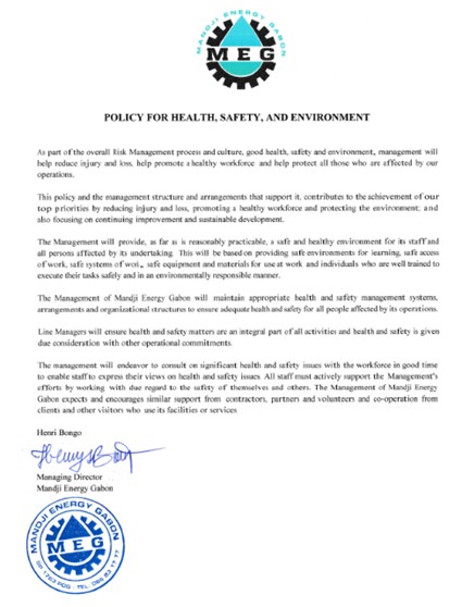 Mandji Energy Gabon has thoroughly prepared itself to enter the upstream sector and has made a particular emphasis on conducting its operations in an impeccable HSE manner. MEG has established its Health, Safety and Environment (HSE) policy as a first priority matter and has developed its own Safety Management System (a document of 220 pages) that stipulates how operations will be conducted. MEG intends to seek the following certifications: ISO 9001 (Quality Management), ISO 14001 (Environmental Management), and ISO 45001 (Health and Occupational Safety)